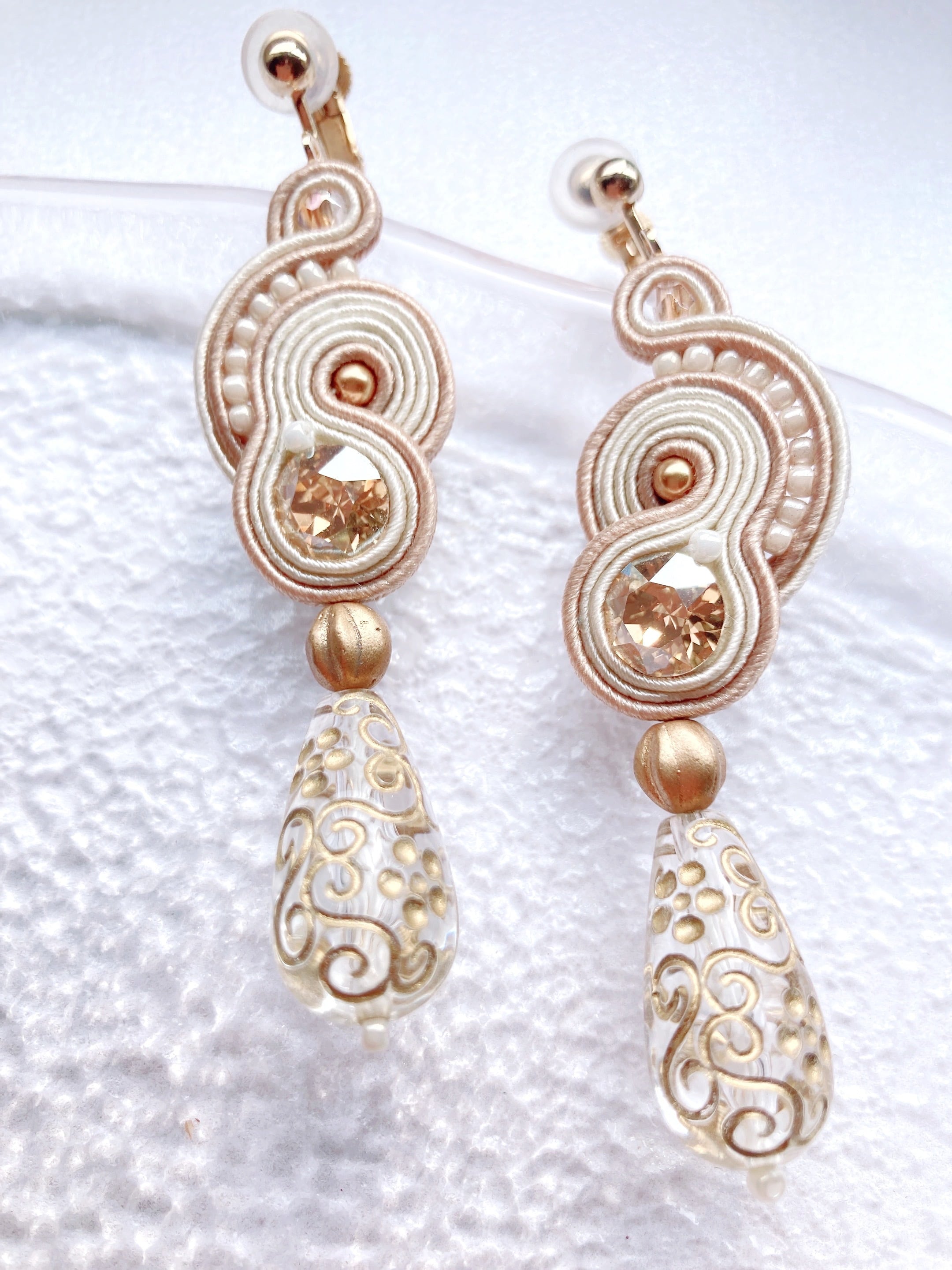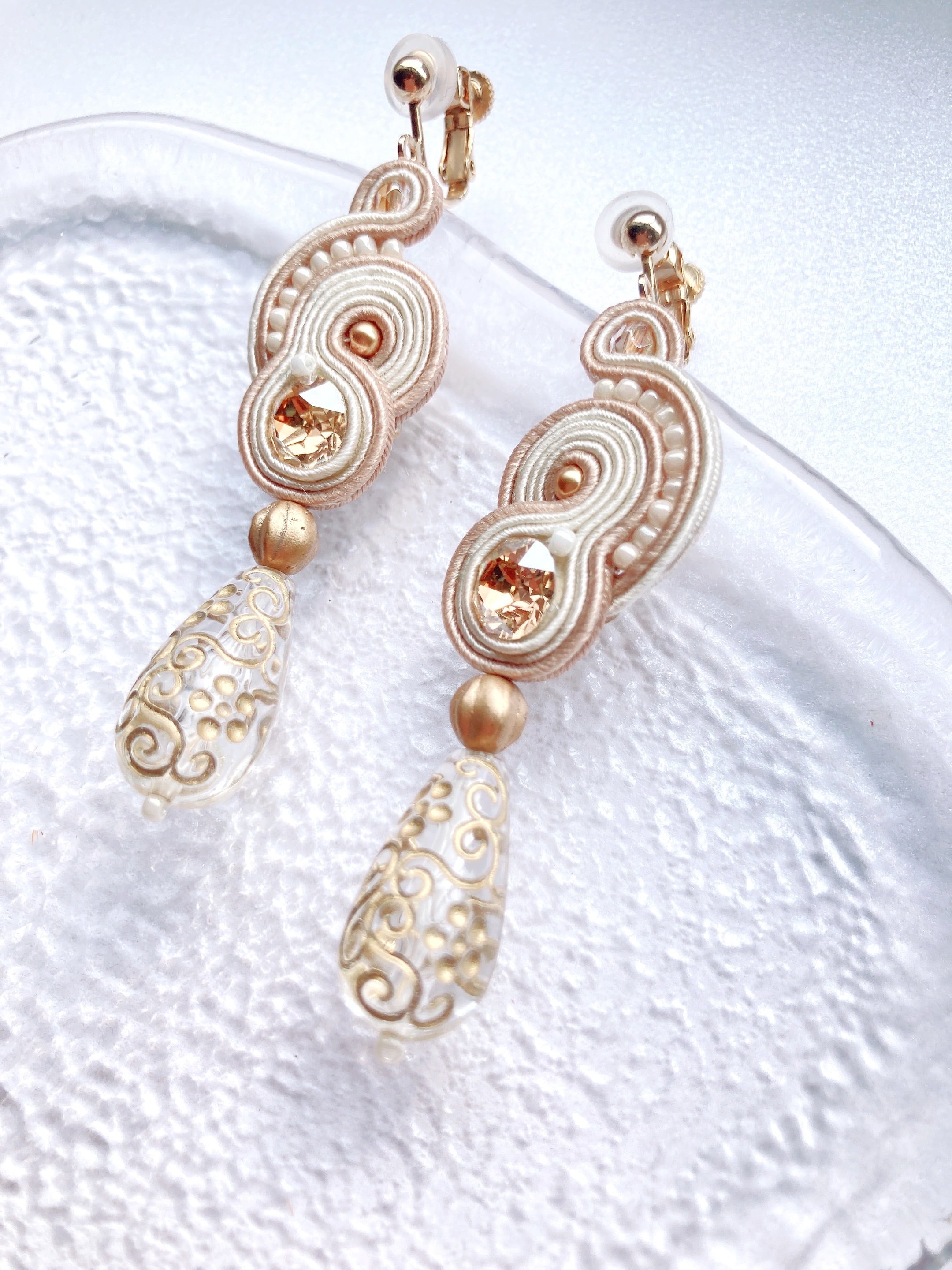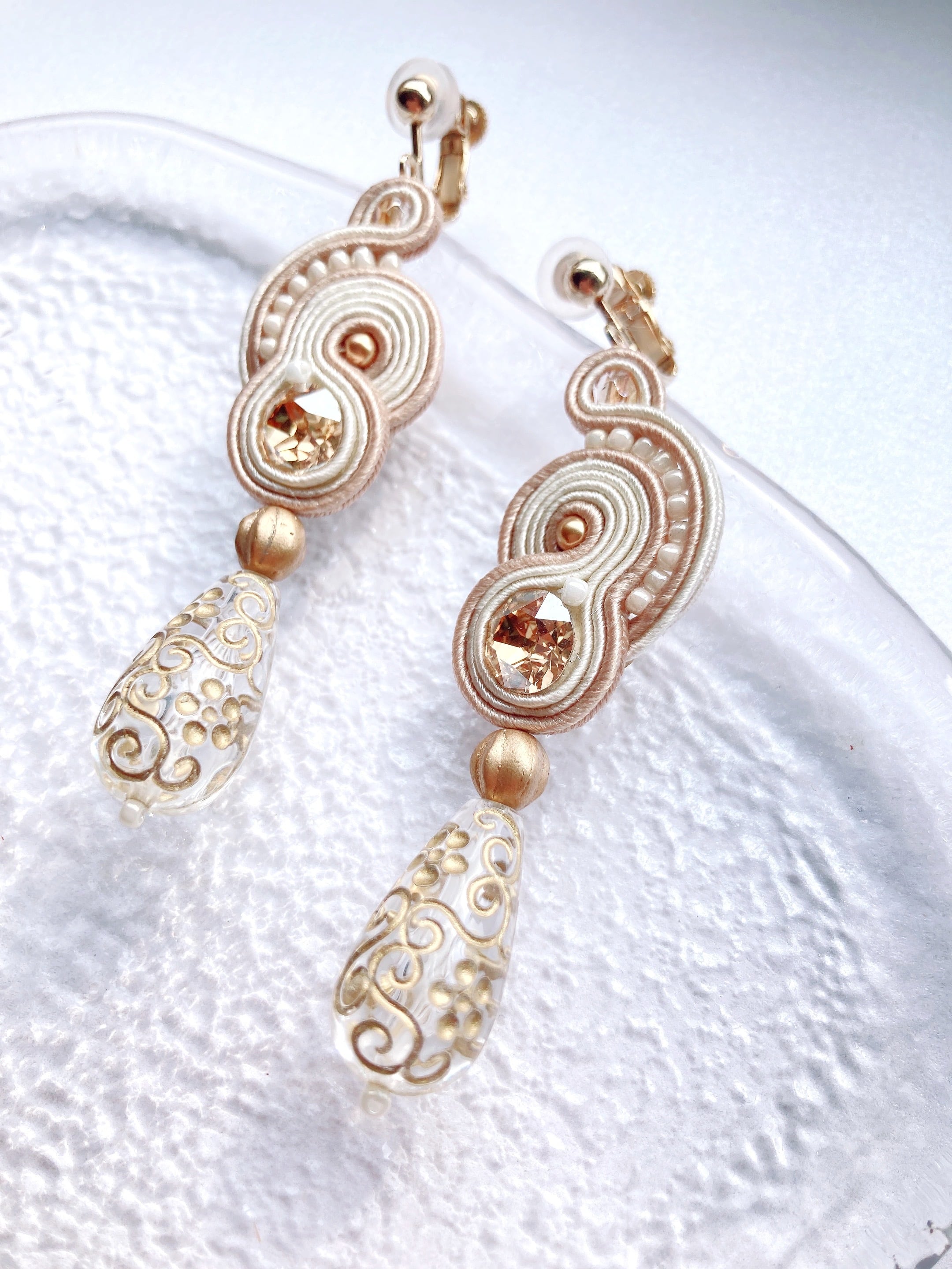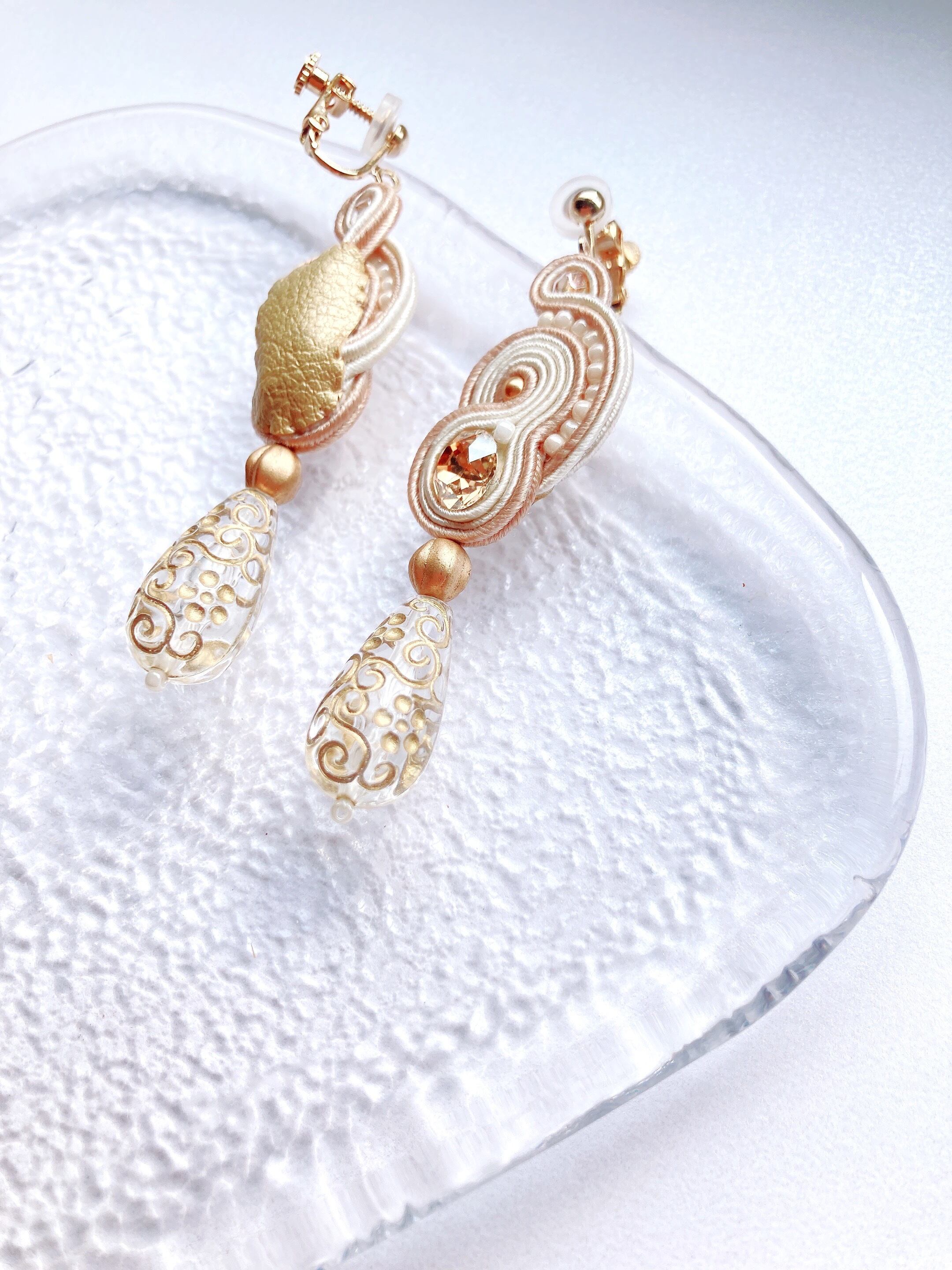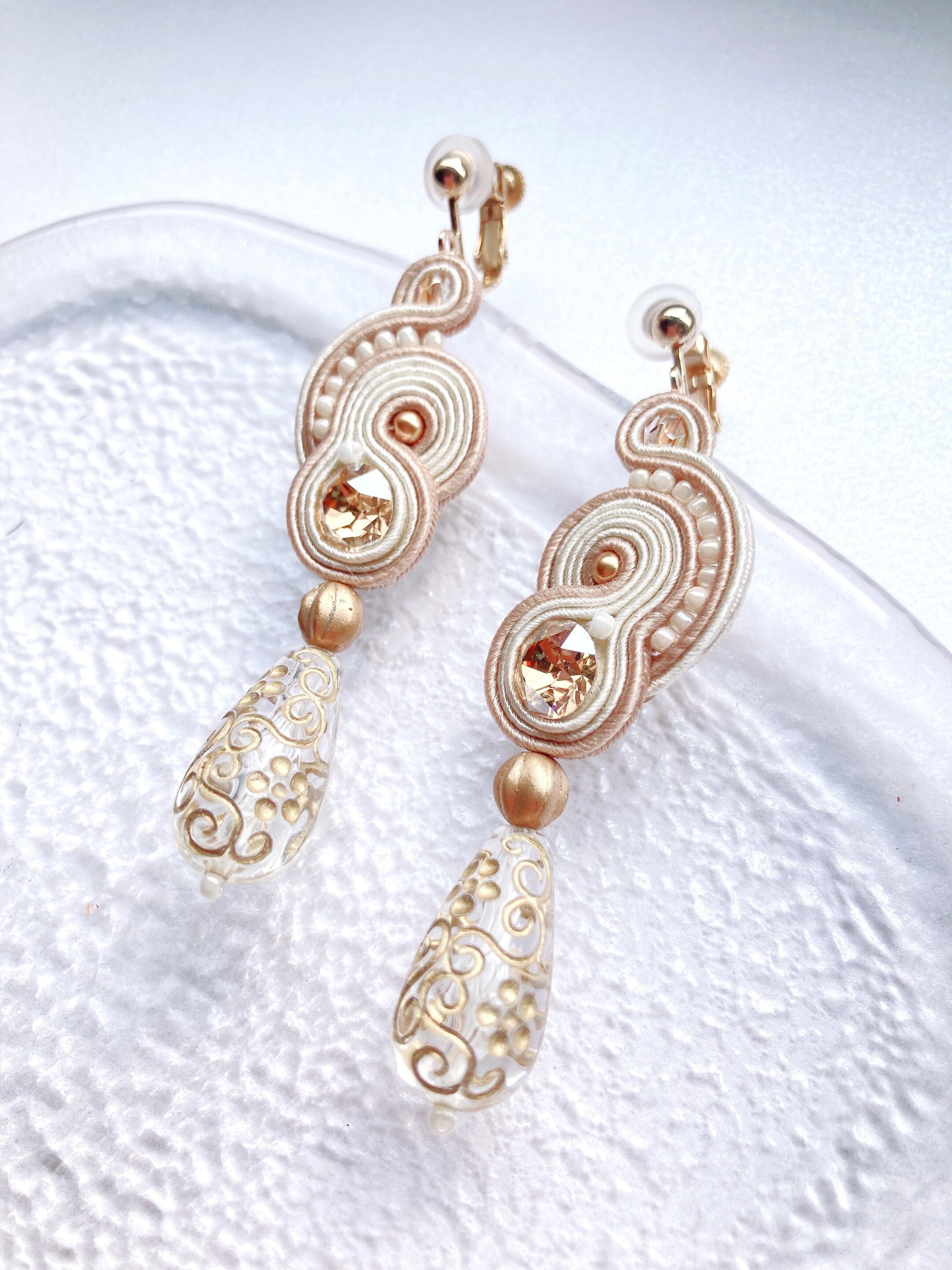 ▶素材▶オーストリア製クリスタルビジューとパール,ドイツ製アクリルパーツ,ビーズ,チェコビーズ,ピアスorイヤリング金具,ソウタシエコード,裏布,糸